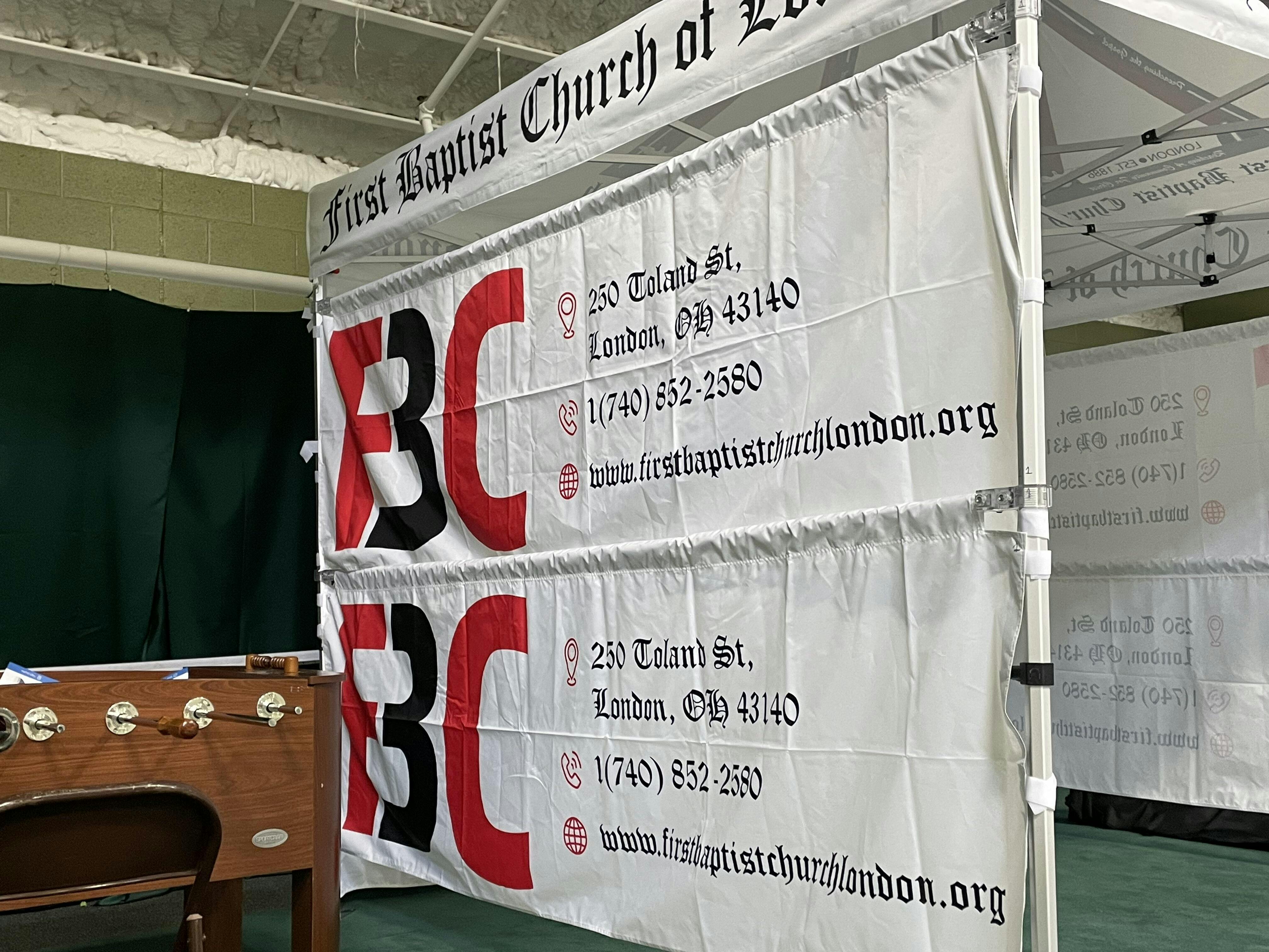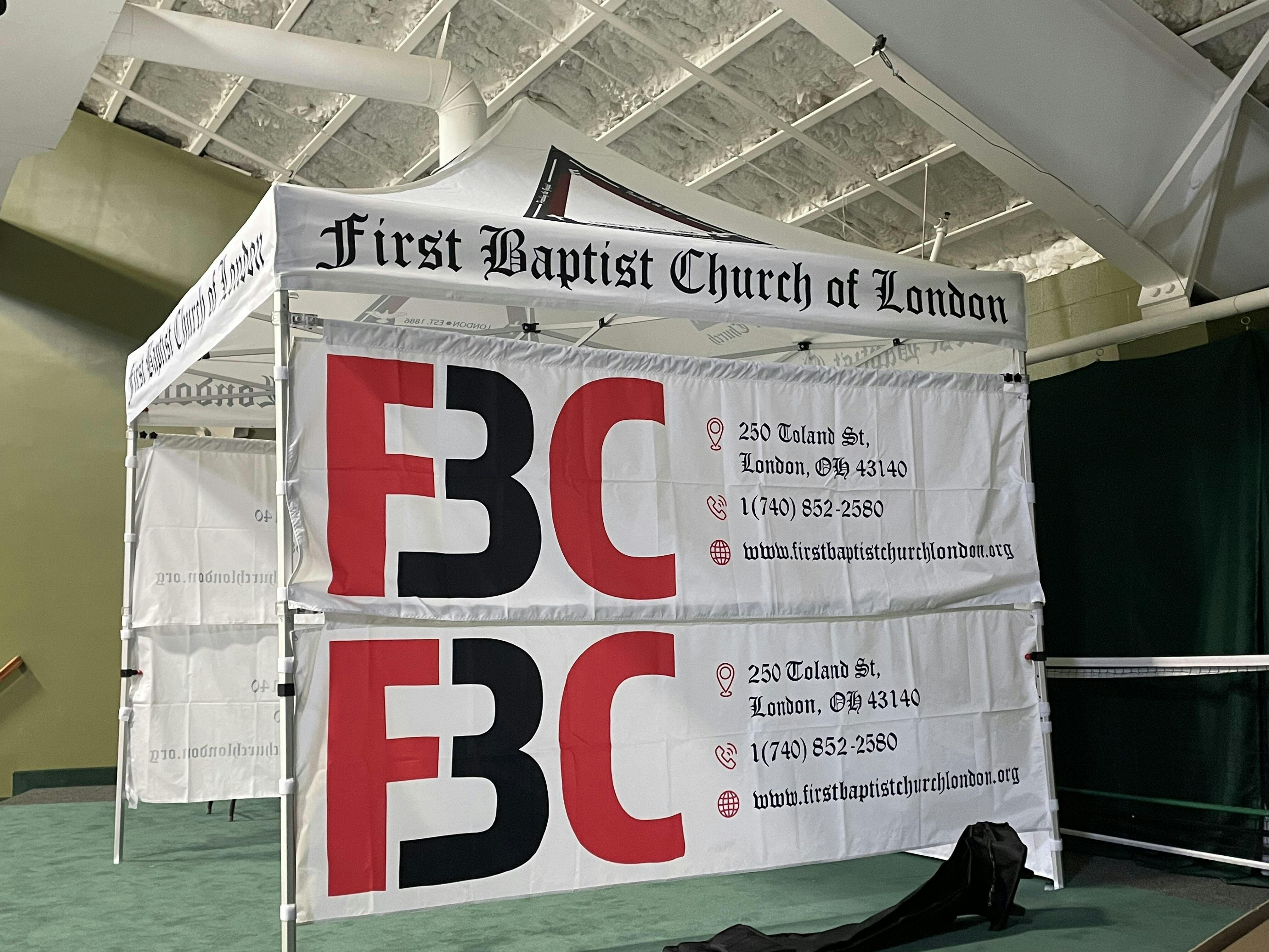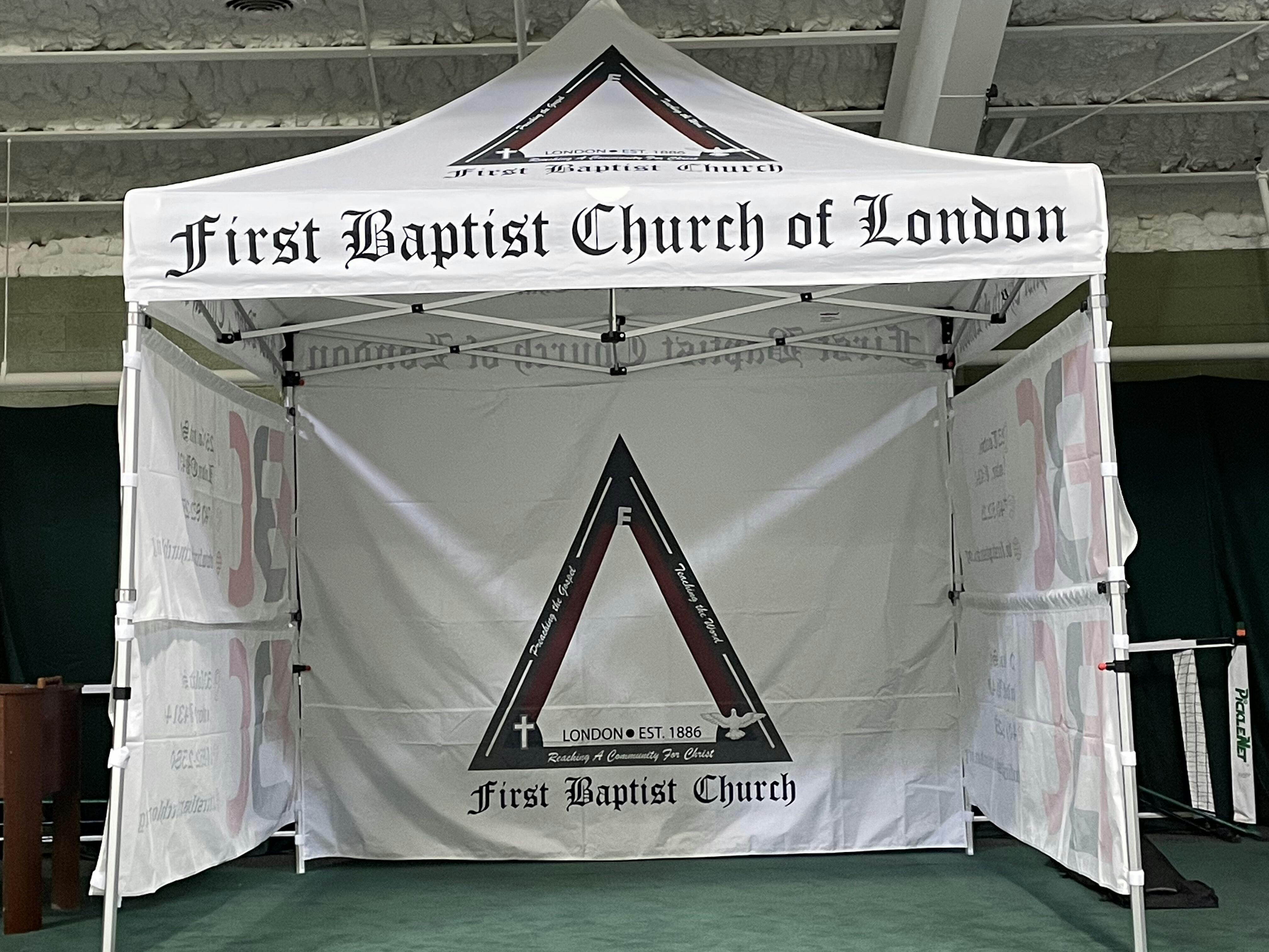 We purchased a 10 by 10 tent w logo and printing on the top. And a printed table cover