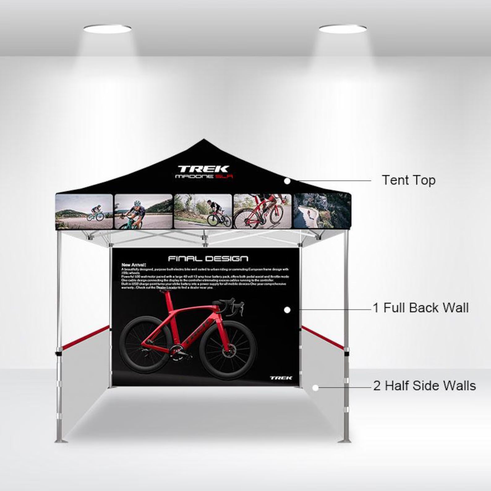 We purchased a 10 by 10 tent w logo and printing on the top. And a printed table cover