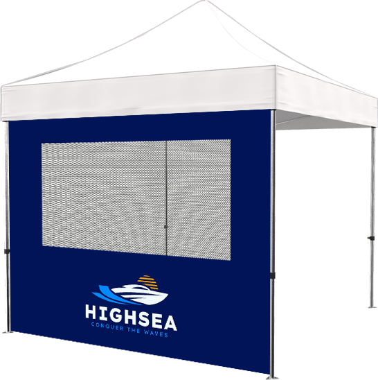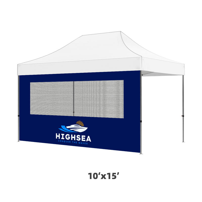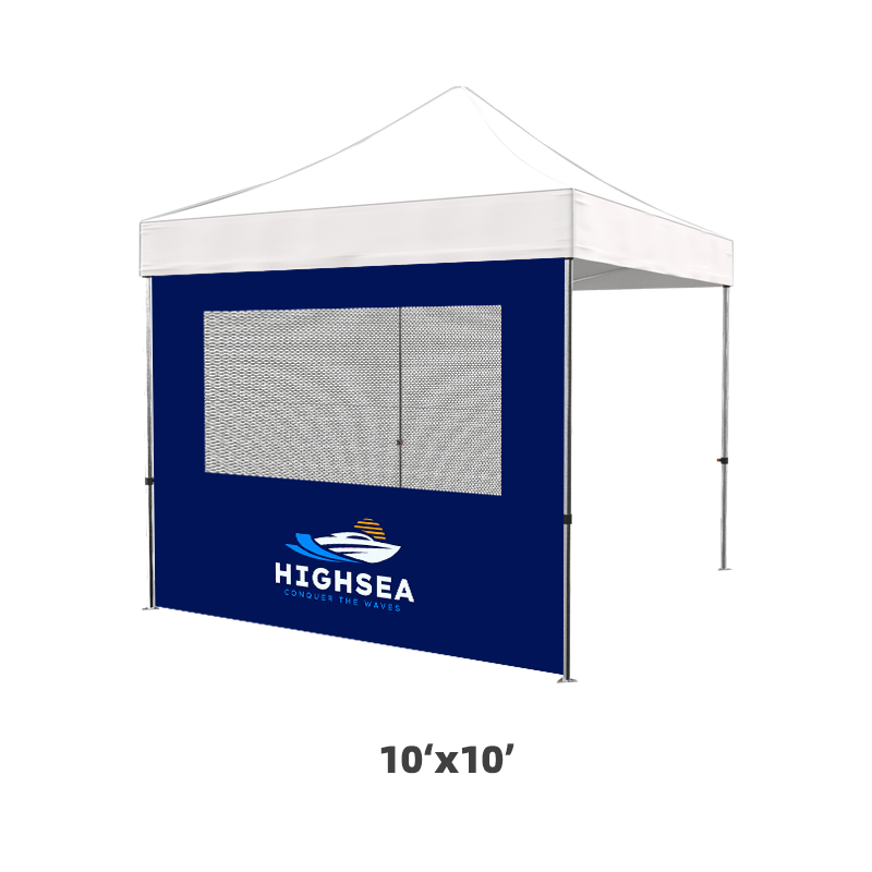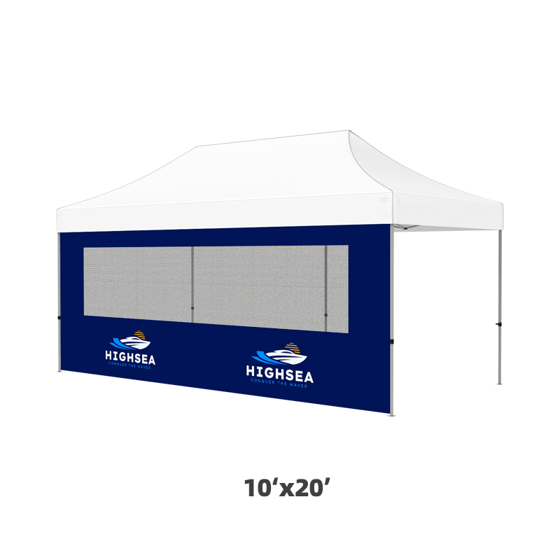All our full walls come with Velcro on the top edge (both front and back sides), so you can easily attach them to your canopy tops. On the fabric, you can print a design to match your tent top. You can choose single-sided or double-sided print. As the Velcro is sewn on both the front and back sides, You can choose single-sided or double-sided.